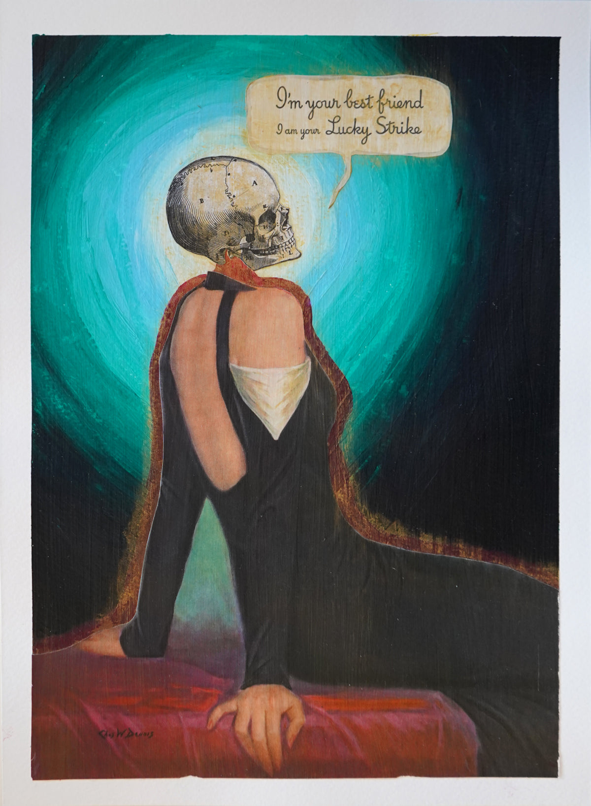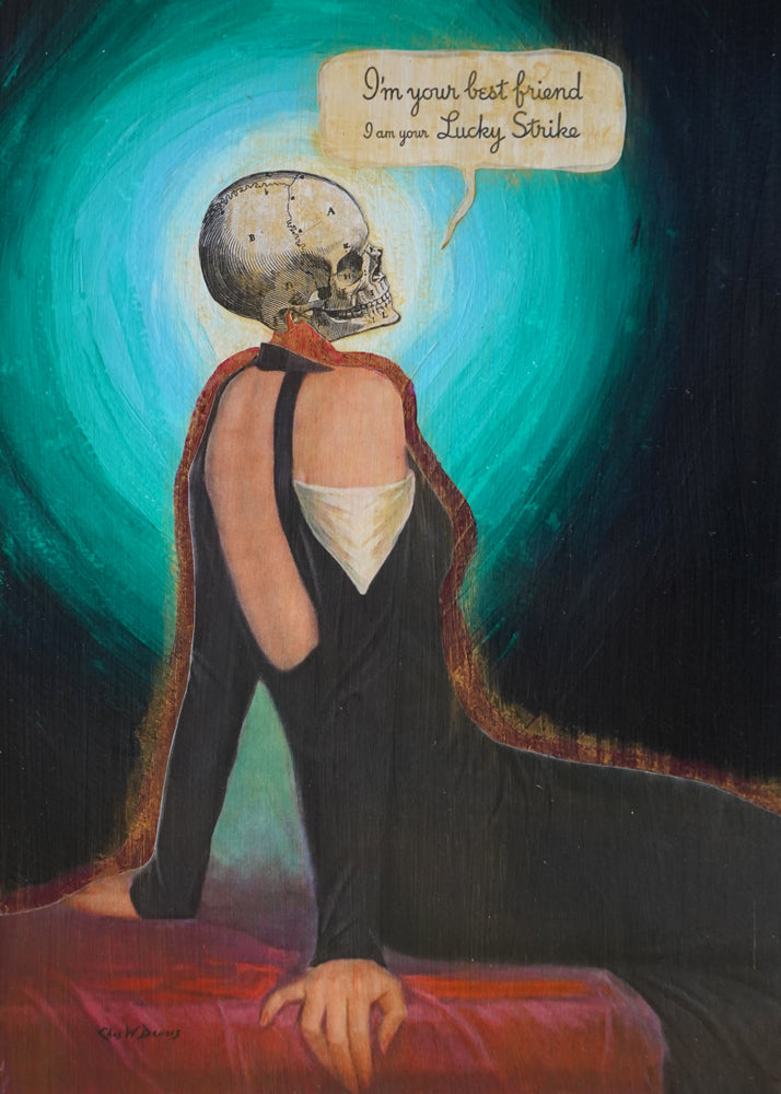 Best Friend explores the darker edges of loyalty, endings, and the promises we make to one another. Vintage ephemera from a classic illustrated female figure and fragments of a Lucky Strike advertisement are layered with acrylic paint to create tension between sweetness and darkness.