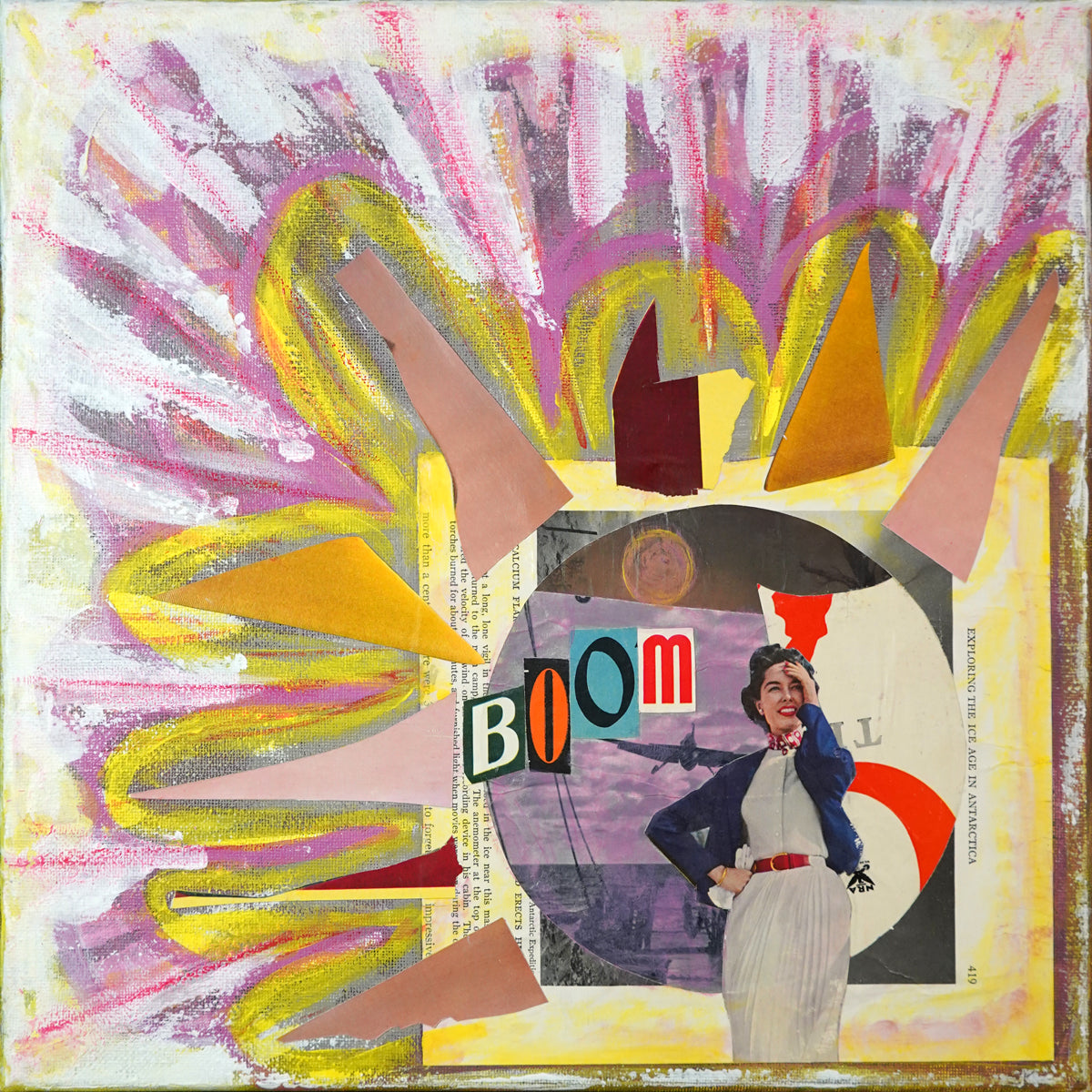 Boom is a mixed-media collage and acrylic exploration built around the visual impact of the word itself. Created in February 2026 as part of the international Februllage daily art challenge.