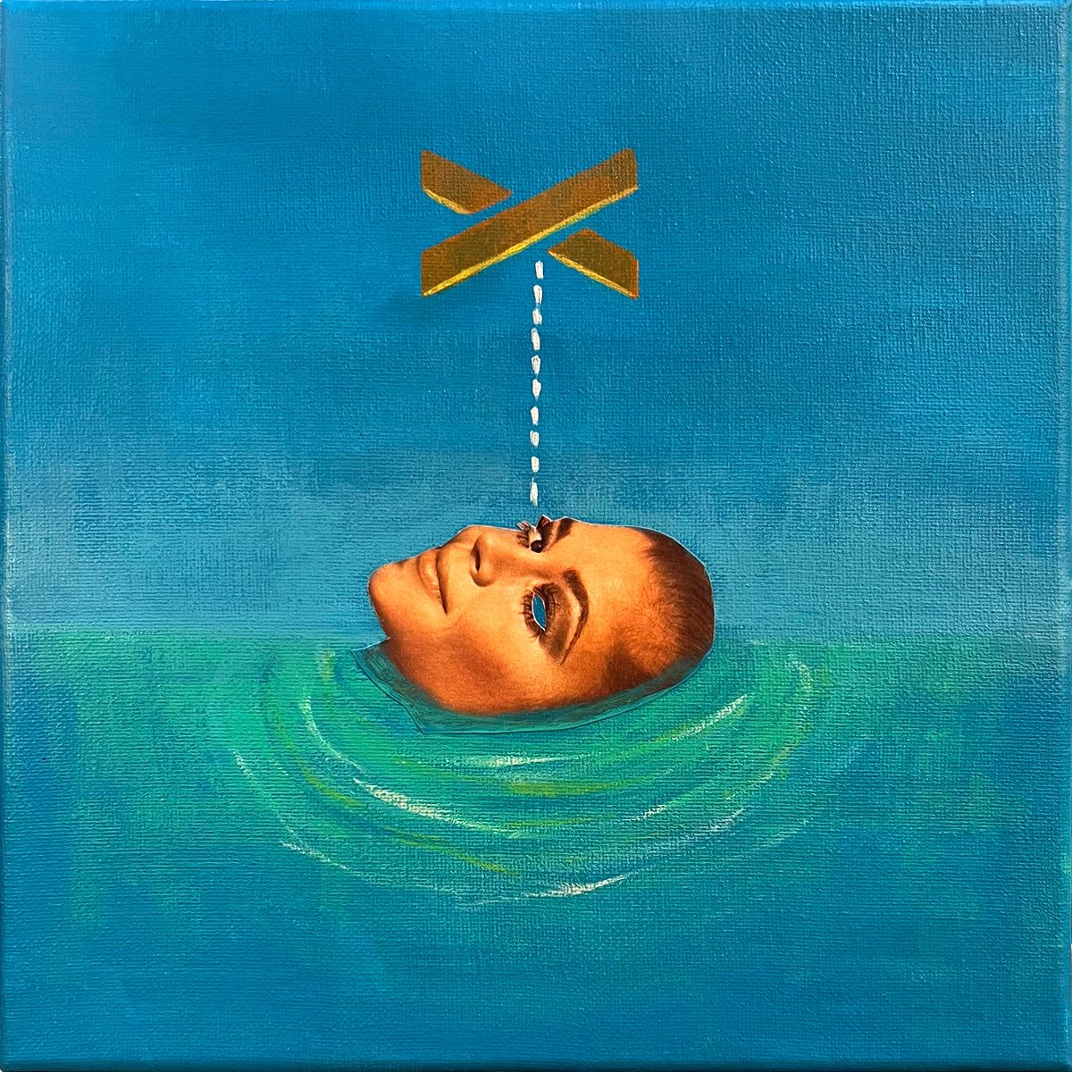 Eye on the Prize is a small analog mixed-media collage centered on focus and resilience. A woman’s face appears capsizing beneath layered, soft blue acrylic, yet her single visible eye remains fixed on an “X” marking the spot. The surrounding water suggests overwhelm, while the steady gaze speaks to determination, clarity, and refusing to be pulled under.